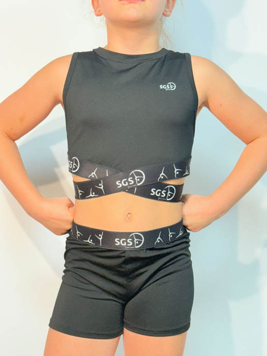 Wygodny, elastyczny i szybkoschnący 2 częściowy komplet do trenowania sportów gimnastycznych i gimnastycznopodobnych. Top z szeroką gumą oraz logiem na piersi oraz bluza ze stójką i zamkiem błyskawicznym z brokatowym logo na plecach, napisem "your move" na rękawach oraz logo na piersi.