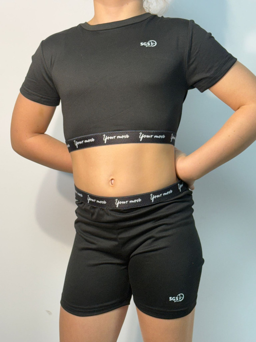 Wygodny, elastyczny i szybkoschnący 2 częściowy klasyczny komplet do trenowania sportów gimnastycznych i gimnastycznopodobnych. Krótka bluzka oraz spodenki z gumą your move i logo na piersi oaz na leginsach.